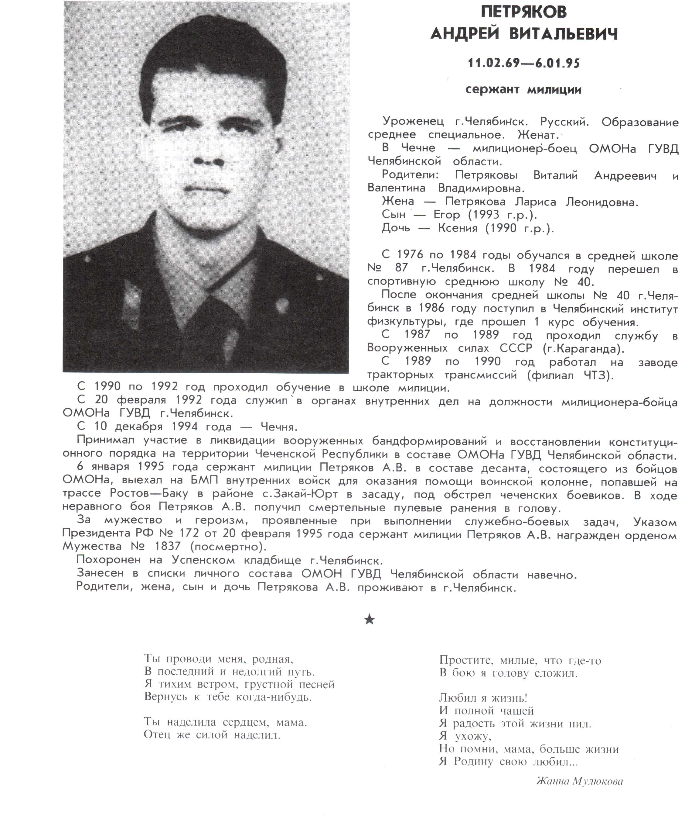 занесен в списки личного состава ОМОН ГУВД Челябинской области навечно. На здании муниципального образовательного учерждения - средней образовательной школы №40 г.Челябинска открыта мемориальная доска памяти Андрея Петрякова