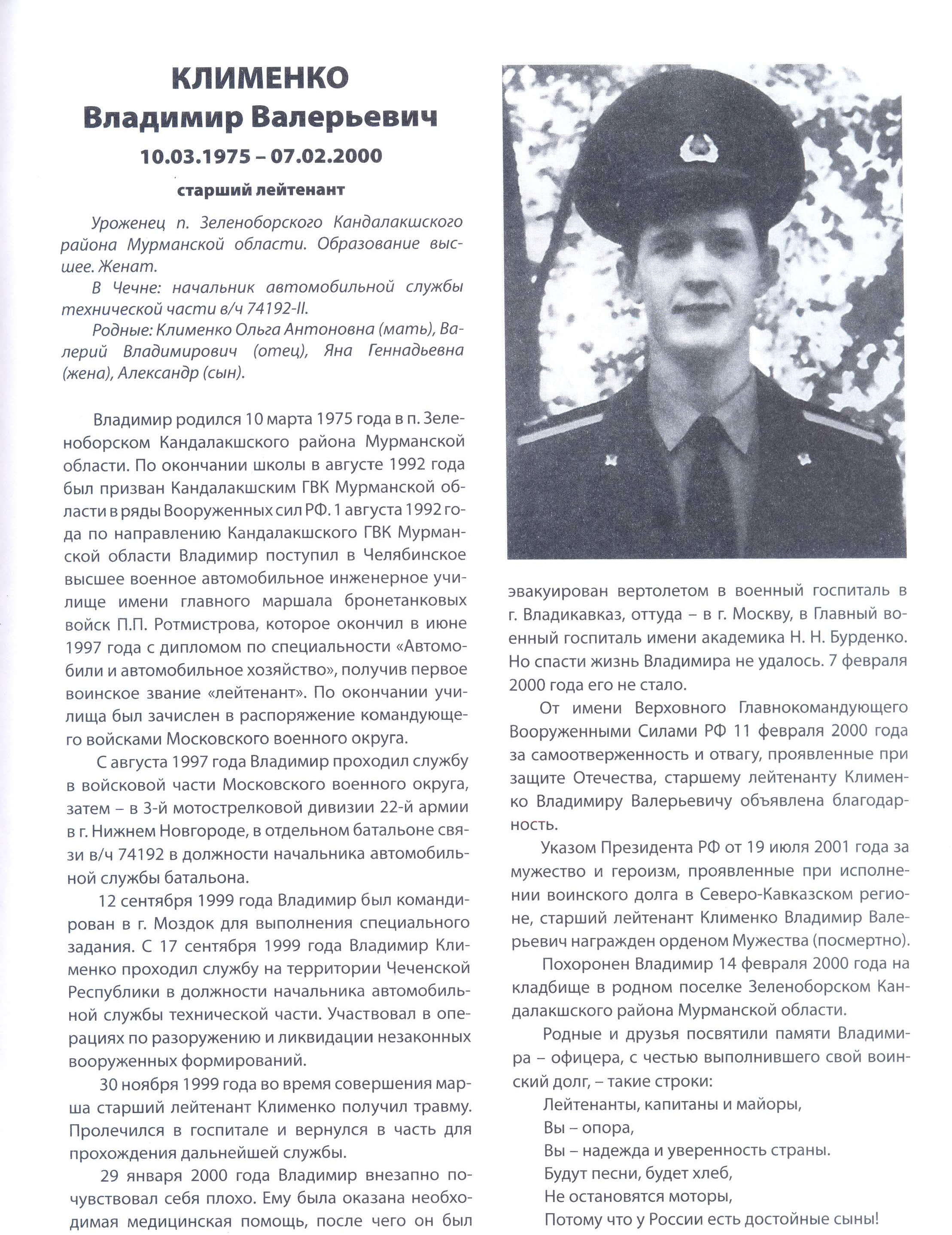 Мемориальная доска c записью на плите Клименко В.В.