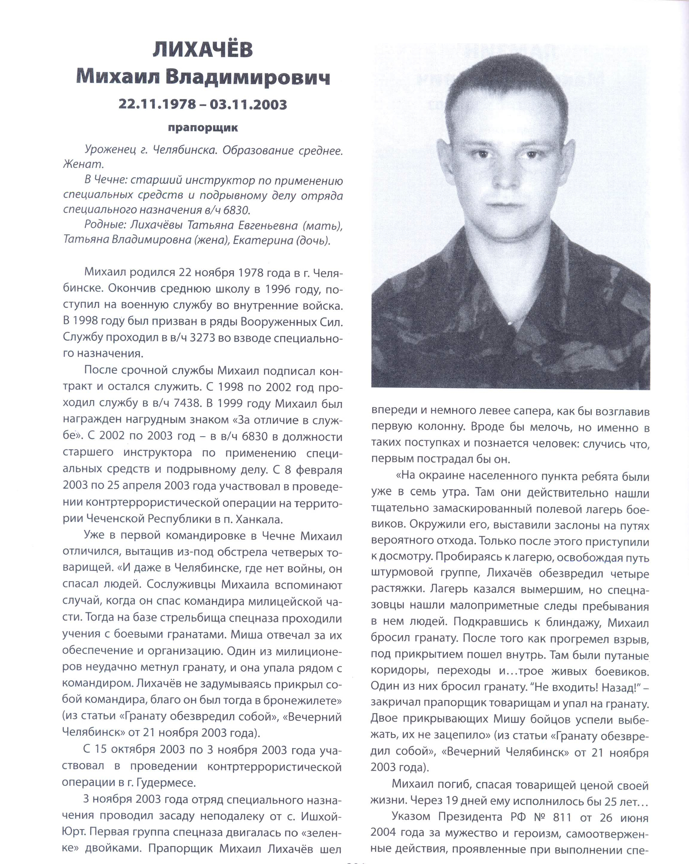 Советом Братства краповых беретов прапорщик Лихачёв Михаил Владимирович награжден краповым беретом (посмертно)