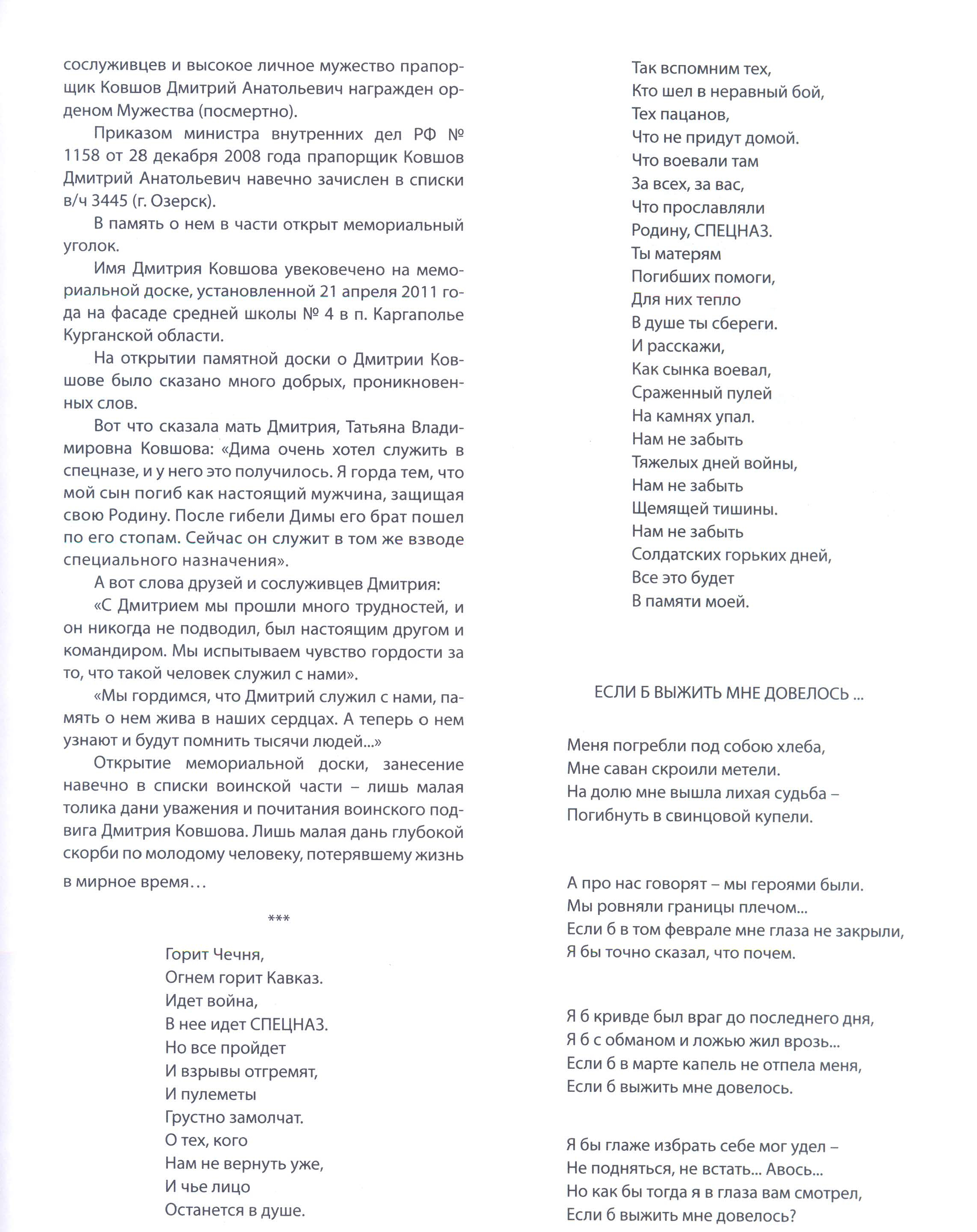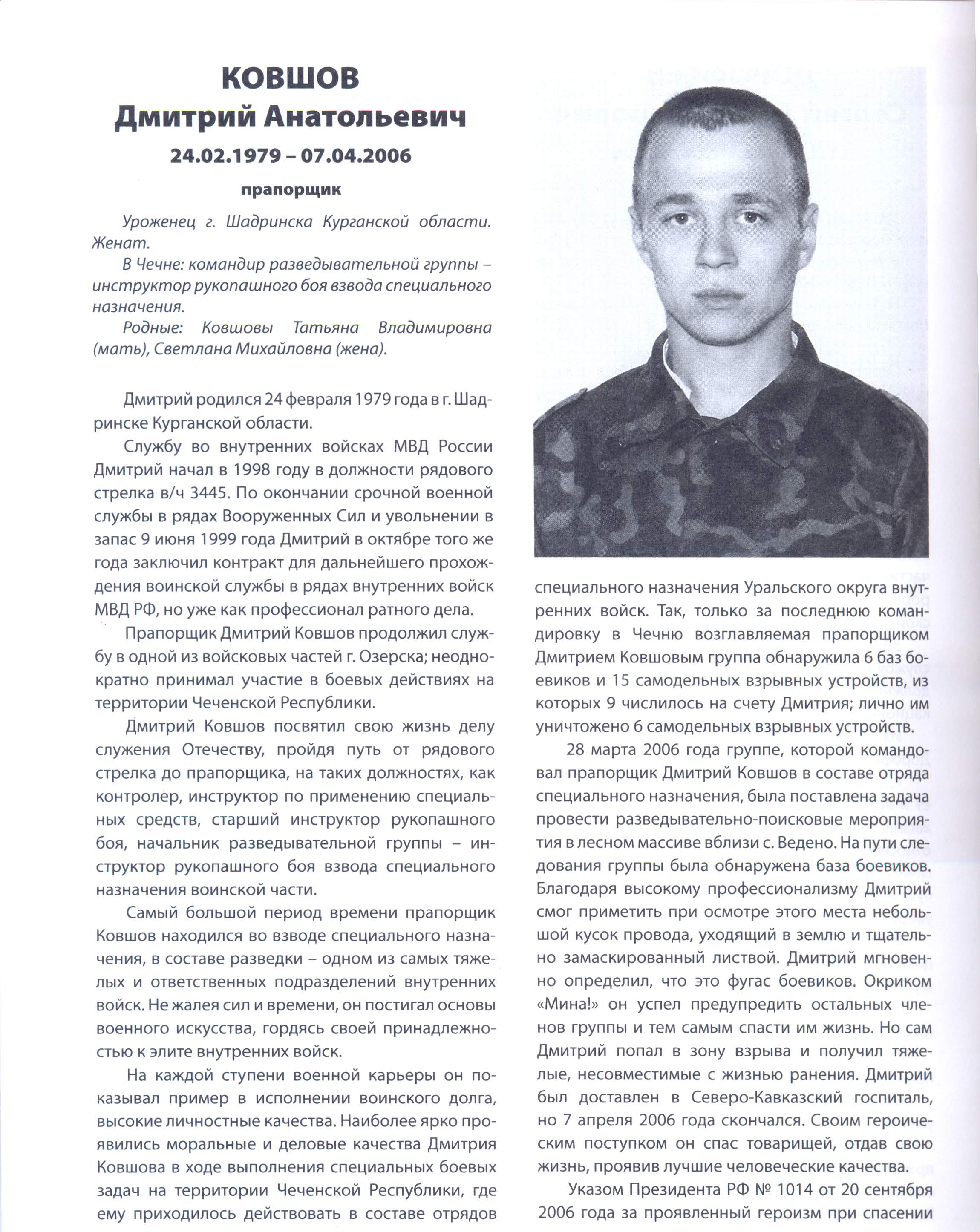 Ковшов Дмитрий Анатольевич навечно зачислен в списки в/ч 3445 (г. Озерск), в память о нем в части открыт мемориальный уголок, имя Дмитрия Ковшова увековечено на мемориальной доске, установленной на фасаде средней школы № 4 в п. Каргаполье Курганской области.